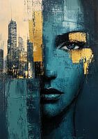 Vrouw Stad | Urban Gaze - Dit stedelijk schilderij combineert een vrouwengezicht in blauwtinten met gouden abstracte elementen en een stadssilhouet op de achtergrond.