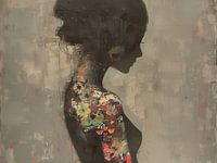 Vrouw Tatoeage | Vrouw in Profiel met Tatoeage - Op dit vrouwen schilderij zie je een stilstaande vrouw in profiel met een kleurrijke bloemen- en vlinder tatoeage op haar schouder, tegen een rustige grijze achtergrond.