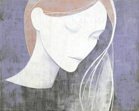 Vrouw Van Lavendel - Hier zie je een ingetogen, bijna fluisterend vrouwelijk profiel — een groot, ovaal gezicht en een lange hals die rustig naar beneden buigt. Het meest opvallende is het enorme, bijna poreuze witte vlak van de huid: geen rimpels, geen felle lijnen, alleen zachte schaduwen rond het gesloten oog en de lip. Die witte vlakte neemt bijna het hele midden van het schilderij in en voelt tegelijk aanwezig en vluchtig, alsof het gezicht uitlicht in een schemer. Als kunstenaar is hier gekozen om het gezicht als hoofdvorm bijna monochroom te laten verschijnen, zodat het de kijker dwingt aandacht te geven aan contournauwkeurigheid en stilte: een vrouw schilderij waarin het gezicht zelf de stilte draagt.