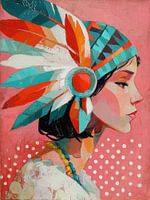 Vrouw Veren - Dit is een vrouw schilderij van een vrouw met kleurrijke veren en een opvallende halsketting, gepresenteerd tegen een zachte roze achtergrond met een speelse stippenpatroon.