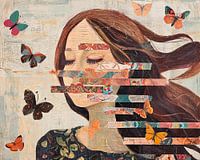 Vrouw Vlinders - Dit schilderij toont een vrouwelijk profiel waarin twee dingen meteen je aandacht pakken: het gezicht dat in strakke horizontale stroken is gefragmenteerd en de kleurrijke vlinders die eromheen zweven. Als kunstenaar is gekozen voor die stroken als een soort geheugenregister: fragmenten van patronen, krantenprint en…