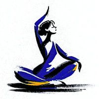 Vrouw Yoga | Tranquil Yoga Vibes - Dit is een vrouw schilderij van een rustige vrouw in een yogahouding met een uitgesproken blauwe outfit en een hand omhoog, die een gevoel van balans en sereniteit oproept.