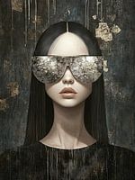 Vrouw Zonnebril | Vrouw Zonnebril - Op dit vrouwen schilderij zie je een vrouw met opvallende grote zonnebril en een strakke, lange zwarte haarlijn, tegen een donkere en verweerde achtergrond vol textuur.