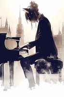 Deze Modern digitale kunst toont een intrigerende scène waar een vrouw, getoond in silhouet en gedetailleerd in een zwart-witte tint, gepassioneerd piano speelt. De achtergrond, met een uitgesproken Art Nouveau-stijl, onthult een gedetailleerde stadssilhouet dat bijna in de lucht lijkt te zweven, wat een dromerige en bijna…