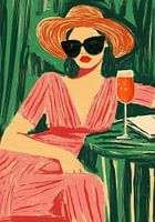 De illustratie toont een vrouw die frontaal aan een ronde groene tafel zit. Ze draagt een brede, oranjekleurige hoed, donker, golvend haar en een roze jurk met verticale plooien, een V-hals en korte mouwen. Haar rechterarm rust op tafel, haar linkerarm is gedeeltelijk bedekt. Op tafel staat een slank wijnglas met roze-oranje vloeistof en wit schuim en een opgevouwen witte doek. De achtergrond bestaat uit dikke, verticale groene penseelstreken die een gestructureerde, grafische buitensfeer creëren. Het beeld is plat, tweedimensionaal, met duidelijke contouren en krachtige kleuren.