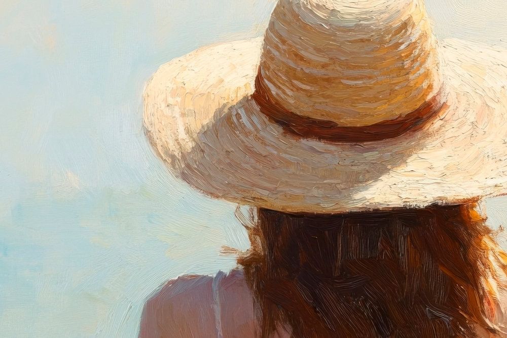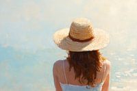 De warme zomerwind streelt zachtjes het krullende haar, terwijl de zonnehoed schaduwen op de rug werpt. Haar blik is gericht op het glinsterende water, dat glinstert in het licht en een sfeer van vrede en rust creëert. Een moment van dromerige uitschakeling, perfect vastgelegd in dit lichtspel.
