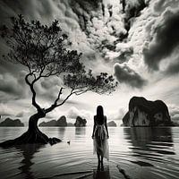 Eenzame vrouw met boom in een meer. Japandi stijl. Gemaakt met A. I. art en digitaal bewerkt met Photoshop.