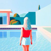 Dit abstracte schilderij toont een vrouw die aan de rand van een zwembad staat. Op de achtergrond de heuvels die zich in de verte uitstrekken. Het contrast tussen de geometrische elementen en de organische achtergrond vormt een harmonieus geheel. Dit schilderij nodigt uit om te dromen en te verbeelden, een uniek kunstwerk voor degenen die op zoek zijn naar iets bijzonders.