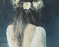 Details: vrouw, bloemen, krans, schilderij, meditatief, donker, rust, kunst, modern, serene
