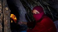 Bij het plaatsje Ait Benhaddou is een vrouw op traditionele wijze brood aan het bakken in een open vuuroven.