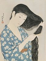 Japanse dame die haar lange lokken bewerkt met een kam op dit portret. Ze draagt een jurk die lijkt op een kimono, een Japans kleed.
