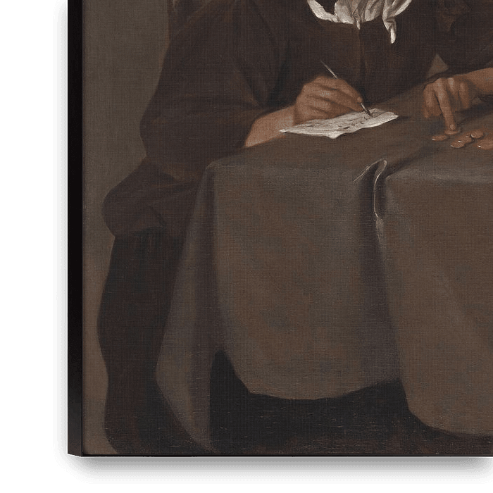 Een zittende vrouw telt het geld dat voor haar ligt naast een open portemonnee op een tafel, en noteert het resultaat zorgvuldig met een pen op een stuk papier. Op het tafelkleed werpt een vage schaduw een lange stok die tegen de tafel is gestoken. Hoewel dit op het eerste gezicht een genrescène lijkt, vertoont het gezicht van de vrouw zulke overtuigende persoonlijke trekken dat het schilderij heel goed een portret kan zijn.
