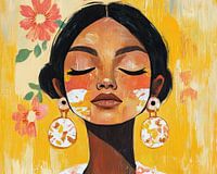 Vrouw en Bloemen | Vrouw met Bloemen - Op dit vrouwen schilderij zie je een vrouw met grote oorbellen en een rustige uitstraling, omringd door heldere bloemen en een warme gele achtergrond die een gevoel van vreugde en meditatie oproept.