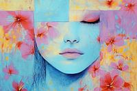 Vrouw en Bloemen - Dit is een vrouw schilderij met een serene uitstraling, waarbij het gezicht van de vrouw subtiel omringd is door kleurrijke bloemen, met een rustige blauwe achtergrond die een gevoel van meditatie en relaxatie oproept.