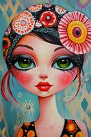 Details: vrouwen schilderij, kleurrijk, bloemen, grote ogen, moderne kunst, expressief, vrouw, schilderij, lichtblauw, felle…