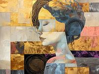 Details: vrouwen schilderij, abstract schilderij, moderne kunst, goud, haar, gezicht, textuur, rust, warme tinten, lijnen