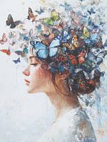 Vrouw en Vlinders | Vrouw en Kleurrijke Vlinders - Op dit vrouwen schilderij zie je een vrouw met een dichte haardos vol kleurrijke vlinders, wat een gevoel van vrijheid en schoonheid oproept, terwijl de zachte, lichte kleuren de aandacht op haar gelaatstrekken vestigen.