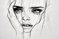 Een minimalistische zwart-wit illustratie toont een jonge vrouw die haar gezicht vasthoudt. Haar intense uitdrukking en de chaotische lijnen brengen gevoelens van verdriet, melancholie en depressie over. De eenvoudige weergave versterkt de emotionele diepte van de afbeelding.