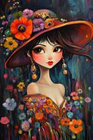 Koop dit bloemen kunstwerk Vrouw in Bloemenkleuren met Hoed van Blikvanger Schilderijen op canvas, aluminium dibond, (ingelijste) fotoprint, behang en ArtFrame, op maat geprint in Fine-Art kwaliteit.
