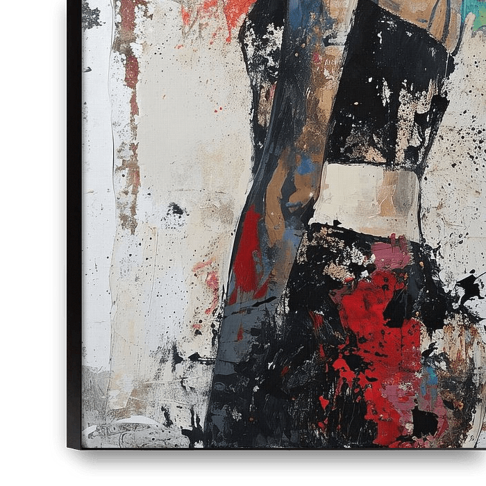 Vrouw in Contrast - De intrigerende compositie, met een vrouwelijk silhouet in profiel, ademt een stedelijke rauwheid uit door zijn textuur en abstracte vormen. Een organisch samenspel van levendige kleuren siert de hoed, terwijl subtiele aardetinten het beeld gronden. Het is een stuk dat een krachtig statement maakt, bedoeld om een…
