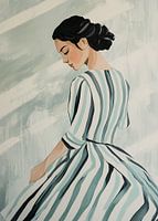 Dit schilderij toont een elegante vrouw in een lichtblauw-wit gestreepte jurk. De jurk, met een vloeiende pasvorm en delicate lijnen, benadrukt de vrouwelijke gratie en eenvoud. Het zachte kleurenschema en de gedetailleerde penseelstreken brengen een tijdloze charme naar voren, terwijl de subtiele lichtreflecties die over de stof…