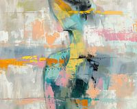 Vrouw in Rustige Kleuren - Op dit abstract schilderij zie je een sensuele, vrouwelijke vorm in rustige kleuren zoals blauw en beige, aangevuld met levendige accenten in geel en roze, wat het geheel een speelse uitstraling geeft.