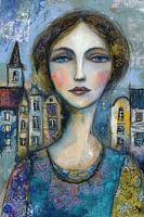 Vrouw in Stad | Vrouw Blauw - Op dit vrouwenportret schilderij zie je een vrouw met een serene uitstraling, omgeven door een kleurrijke achtergrond van huizen en een toren, wat zorgt voor een dromerige sfeer in deze abstracte stijl met blauwtinten.
