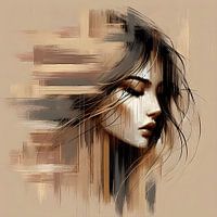 Een dromerig modern abstract olieverfportret van een vrouw met lang haar, gehuld in aardse tinten beige, bruin en goud. De zachte kleuren en vloeiende lijnen stralen een gevoel van warmte, elegantie en innerlijke rust uit. Het spel van licht en schaduw geeft het werk een bijna etherische diepte. De vrouw lijkt gevangen in een stil moment van reflectie, tijdloos en krachtig. Een betoverend werk dat zowel kalme als luxe sferen oproept.