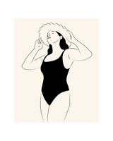 Abstracte minimalistische illustratie vrouw in badpak met zwarte lijnen en vlakken. De achtergrond is licht beige.