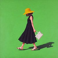 Dit schilderij, getiteld Woman in Motion, is mijn interpretatie van een enkel, vluchtig moment. De vrouw in het midden van het werk belichaamt eenvoud en elegantie, terwijl ze zelfverzekerd voorwaarts beweegt. Gekleed in een mouwloze zwarte jurk straalt ze ingetogen gratie uit, terwijl haar breedgerande gele hoed dient als een gedurfd…
