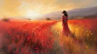 Dit schilderij toont een serene en romantische landschapsscène bij zonsondergang. Een vrouw in een zachte roze jurk wandelt vredig over een smal pad dat door een uitgestrekte, felrode bloemenweide slingert. Het gouden licht van de ondergaande zon strijkt over het landschap, waardoor de velden in warme tinten van rood, oranje en geel…