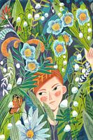 Een mooie illustratie van een vrouw of meisje dat midden in een jungle van natuur staat. Ze wordt omgeven door bloemen en planten en ze kijkt naar een vlinder.