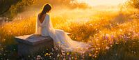 Een eenzame figuur zit in zachte, gouden lichtstralen omringd door bloeiende weiden die de verfijndheid van de natuur weerspiegelen. De combinatie van licht en kleuren geeft een gevoel van rust en contemplatie. Dit harmonieuze motief is perfect voor de slaapkamer, waar het een ontspannen sfeer creëert.