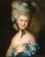 Gainsborough's portret van deze onbekende dame wordt terecht beschouwd als een van de meest charmante en uitstekende werken in de Hermitage-collectie van de Engelse schilderkunst. Hoewel de kunstenaar niet van het schilderen van portretten hield en liever aan landschappen werkte, is het voor zijn portretten dat hij het meest geliefd was en vandaag de dag het meest bekend is. Hier creëerde hij een beeld van grote elegantie en schoonheid, een schilderij gedomineerd door een romantische dromerigheid. De lichte, mobiele, smeltende penseelstreken brengen de zachte huid, de grijsblauwe zijde van de sjaal en de weelderige veer van de hoofdtooi die de pruik in poedervorm overstijgt, over. Vrije, schetsmatige schilderkunst wordt gecombineerd met fijne kleurovergangen om een effect te creëren dat lijkt op pastel. Gainsborough's stijl werd opgemerkt en zeer bewonderd door tijdgenoten, en zelfs zijn grote rivaal, de voorzitter van de Royal Academy, Sir Joshua Reynolds, gaf zijn vaardigheid toe.