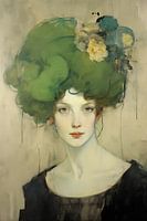 Dit werk, getiteld "Vrouw in het groen," toont een elegante vrouwelijke figuur die centraal staat in een compositie vol groene tinten. De zachte en gedempte kleuren stralen een gevoel van rust en harmonie uit. De abstracte stijl van het werk geeft de vrouw een mysterieuze en dromerige uitstraling, waarbij de groene kleuren mogelijk de natuur symboliseren. De minimalistische details en vloeiende lijnen voegen een vleugje verfijning en zachtheid toe. Dit werk is perfect voor liefhebbers van moderne kunst met een subtiele, serene uitstraling en kan een kalme, stijlvolle sfeer creëren in elke ruimte.