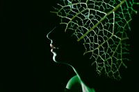 Meerdere door mij gemaakte foto's samengevoegd en bewerkt. Te zien zijn een jonge vrouw en profil met als haar/hoofdbedekking een vergaan blad waarvan alleen de nerven zichtbaar zijn