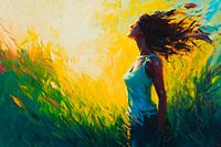 Het tafereel ademt een sfeer van vrijheid: een vrouw staat in het stralende licht en geniet van de warme wind die door haar volle haardos waait. Omringd door heldergroen gras ziet ze er krachtig en levend uit, alsof ze in harmonie met de natuur ademt. Haar gezicht straalt kalmte en vastberadenheid uit, terwijl de wereld om haar heen pulseert.