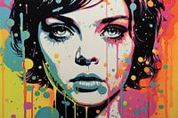 Vrouwengezicht uit de jaren 60 in mixed media met vele kleuren
