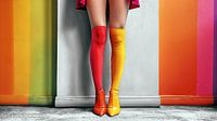 Deze foto toont een vrouw die een korte jurk en kleurrijke panty's en schoenen draagt terwijl ze in een al even levendig interieur staat. Haar kleding is een uitdrukking van individualiteit en moed, de felle kleuren onderstrepen haar levendigheid en creativiteit. Het interieur, ontworpen met opvallende kleuren en vormen, vult de energieke aanwezigheid van de vrouw aan en creëert een harmonieuze, visueel aantrekkelijke omgeving. De combinatie van mode en een kleurrijk interieur creëert een vrolijke, dynamische stemming en nodigt de kijker uit om te genieten van de speelsheid en expressiviteit van het moment.