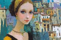 Vrouw in kleurrijke stad - Op dit schilderij zie je een vrouw met een opvallende gele hoofdband en mooie sieraden, met op de achtergrond een kleurrijke stadsgezicht dat doet denken aan de sfeer van Sardinië.