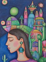 Dit levendige pentekening kunstwerk straalt een vrolijke Mexicaanse en Zuid-Amerikaanse sfeer uit. Centraal staat een gestileerde vrouw met expressieve, grote ogen en een brede glimlach. Ze draagt opvallende, ronde oorbellen die doen denken aan traditionele Mexicaanse motieven.