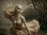 Een expressionistisch schilderij met een vrouw met een vlekkeloos gladde porseleinen huid, lang, stromend blond haar en een enorme, sierlijke jurk die gemaakt lijkt te zijn van delicate, wervelende stof. De vrouw staat in een mistig, mystiek boslandschap en haar gezichtsuitdrukking toont een mengeling van nieuwsgierigheid en vrees. Op…