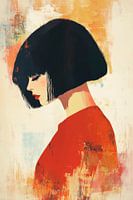 Een elegant silhouet dat glinstert in zachte kleuren belichaamt stijl en tijdloosheid. Het contrast tussen het diepzwarte haar en de warme rode kleur van het kledingstuk trekt onmiddellijk de aandacht. Perfect voor de woonkamer, waar het een sfeer van creativiteit en charme creëert die elke bezoeker zal boeien.