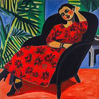 Dit kunstwerk toont een eigentijdse interpretatie van een zittende vrouw in een rode stoel. De kunstenaar heeft de traditionele portretstijl losgelaten en heeft gekozen voor een semi-abstracte benadering, waarbij de vrouw en de stoel herkenbaar zijn, maar met een speelse twist.