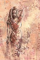 Digitaal schilderij van een jonge vrouw in een rode jurk. Deze vrouw is in gedachten verzonken. Met gesloten ogen staat ze omringd door prachtige warme tinten, geel zalm roze en rode accenten. Dit kunstwerk is een digitale bewerking van één van mijn eigen handgetekende pentekeningen. De zwarte lijnen van de pentekening zijn deels nog zichtbaar in dit werk. Dit kunstwerk heeft een staand formaat. Het werk heeft vurige warme kleuren en is een echte eyecatcher voor aan jouw muur.