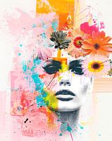 Een portret van een vrouw, opgebouwd uit transparante lagen van bloemen en abstracte structuren. De huid is zacht en glad, maar grotendeels overgenomen door kleur. Haar ogen zijn gesloten en de lange wimpers zijn duidelijk zichtbaar. Over haar gezicht en haarpartij zijn talloze bloempatronen en aquarelachtige vlakken te zien, in tinten van geel, paars, turquoise, roze en oranje.