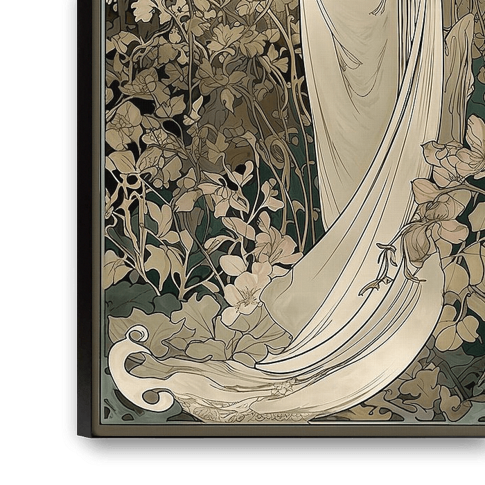Vrouw in weelderige tuin, stijl Alphonse Mucha