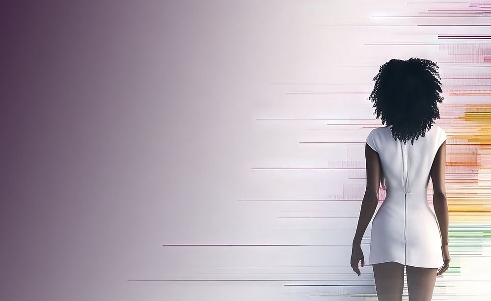 Illustratie van een Afro-Amerikaanse vrouw in een witte jurk die vanuit een donkere kamer in kleurrijke, abstracte lichtstralen stapt. De afbeelding symboliseert hoop en de overgang naar een positieve toekomst en inspireert met zijn krachtige boodschap.