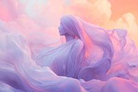 Zachte pastelkleuren omhullen een majestueuze figuur die zweeft in een droom van wolken. De vloeiende stoffen en delicate aanwezigheid geven de compositie een etherische gratie. Dit kunstwerk is perfect als blikvanger in de slaapkamer en creëert een rustgevende en inspirerende sfeer die uitnodigt om te dromen.