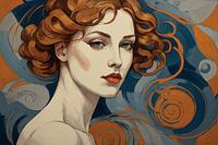 Betover je ruimte met de elegante uitstraling van een tijdloos kunstwerk. Dit prachtige schilderij, geïnspireerd door de verfijnde Art Nouveau-stijl, toont een beeldschone vrouw omgeven door een sierlijk patroon van golvende lijnen en spiralen. De harmonieuze combinatie van rijke blauw- en oranjetinten met subtiele accenten van goud en…